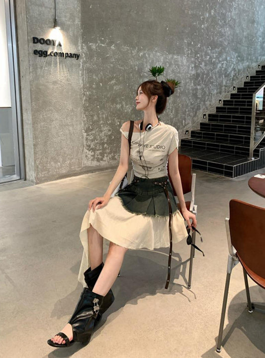 日本直送 [預購] 拼接不規則布料牛仔裙 ◍ 2色入