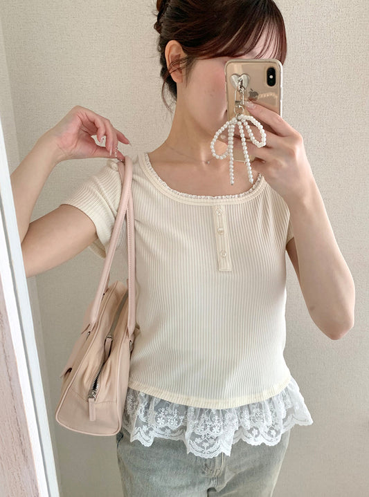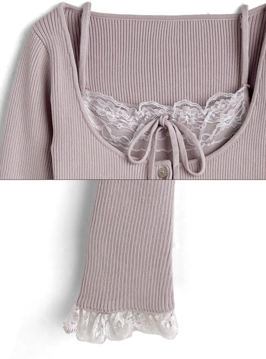 日本直送 [預購] 拼接蕾絲·羅紋針織上衣 ◍ 3色入