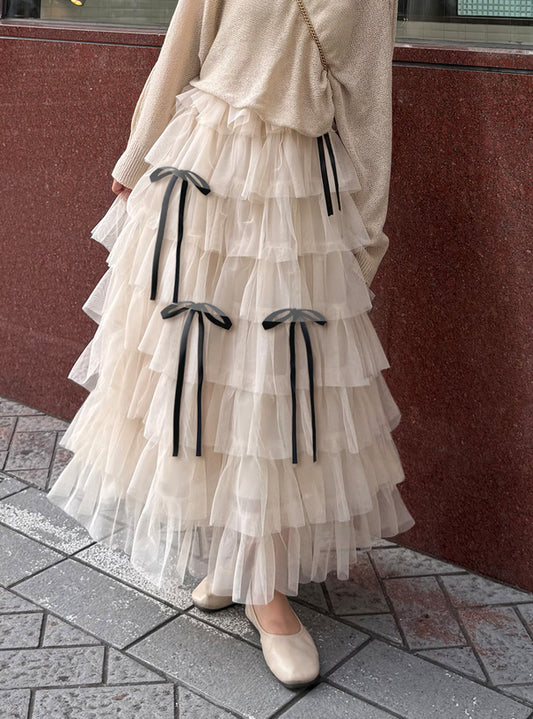日本直送 [預購] 蝴蝶結౨ৎ紗紗蛋糕長裙 (米白 アイボリー)