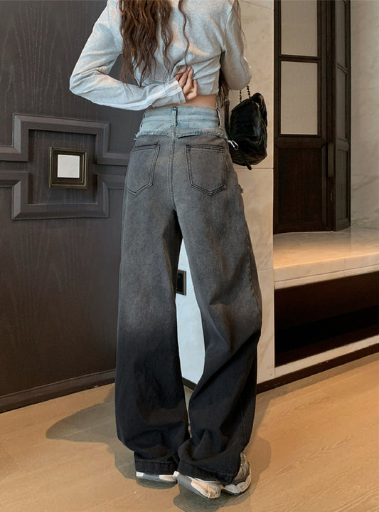 日本直送 [現貨] 拼色流蘇➕漸變色牛仔寬腳褲 (藍拼黑)