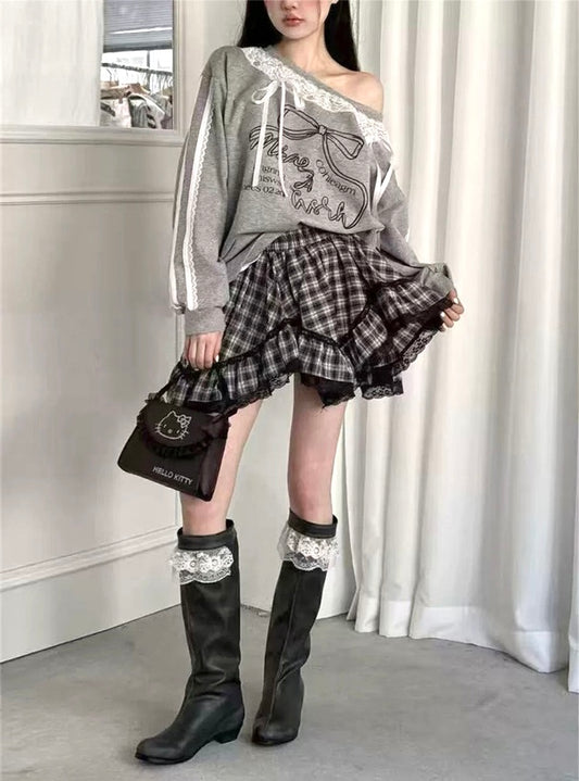日本直送 [預購] 不規則蕾絲下擺·格仔短裙 (黑 ブラック)