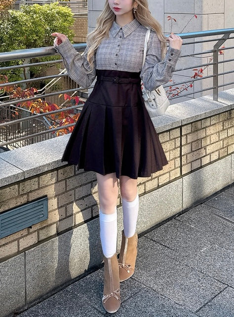 日本直送 [預購] 一套2件setup ⇉ 格仔拼接恤衫➕蛋糕短裙