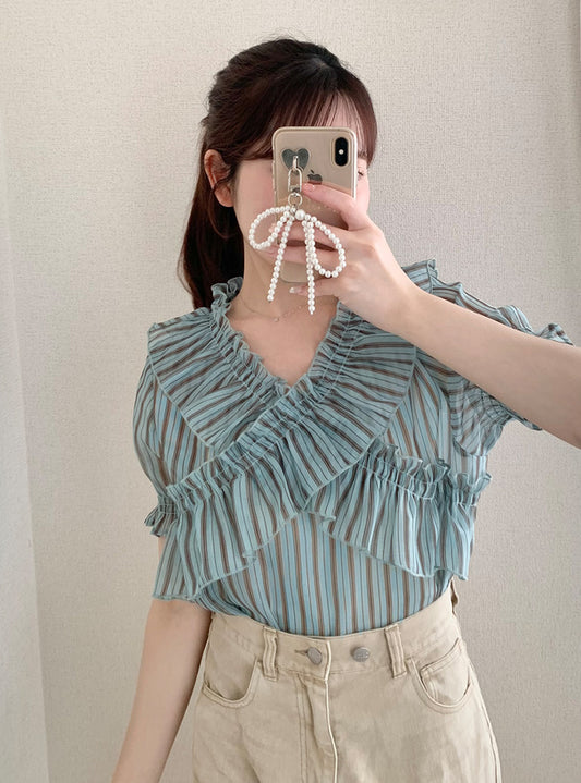 日本直送 [預購] 薄荷朱古力間條·交叉皺褶上衣