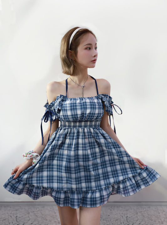 日本直送 [現貨/ 預購] 2種穿法·掛頸綁帶౨ৎ 格仔連身裙 (深藍 ネイビー)
