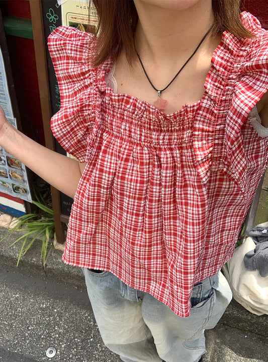 日本直送 [預購] 格仔·荷葉邊肩帶上衣 ◍ 2色入