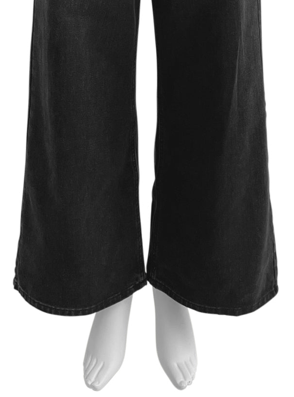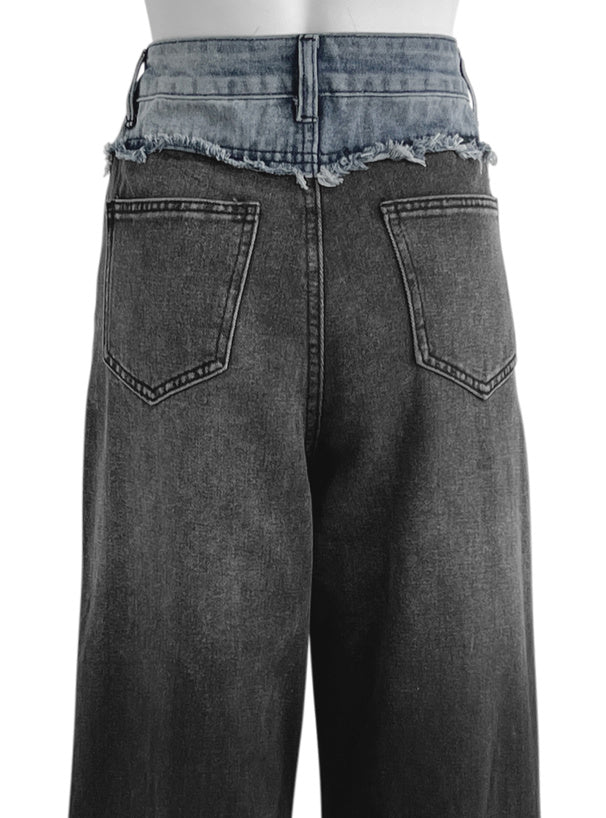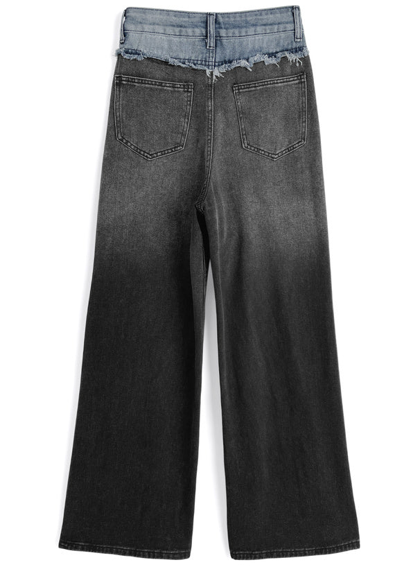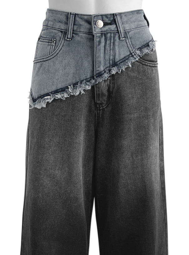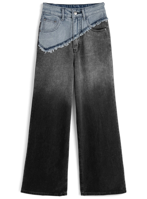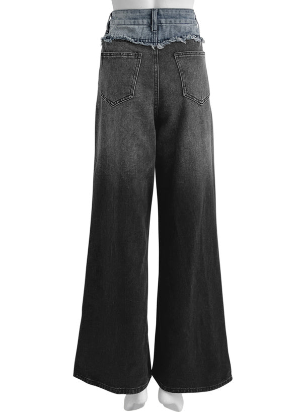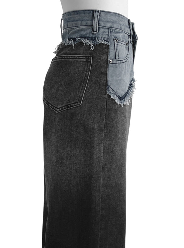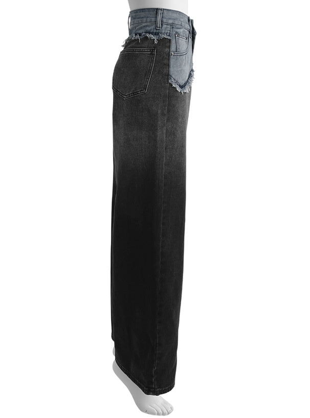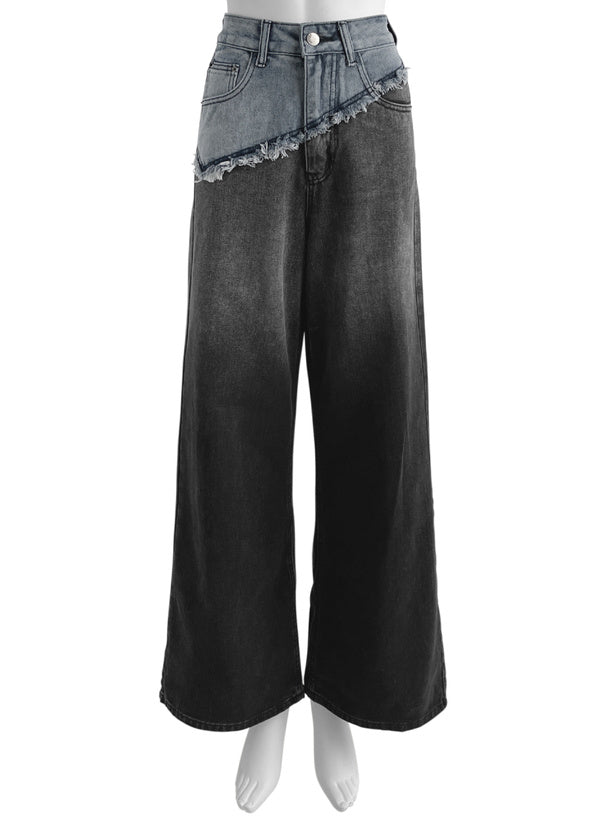 日本直送 [現貨] 拼色流蘇➕漸變色牛仔寬腳褲 (藍拼黑)