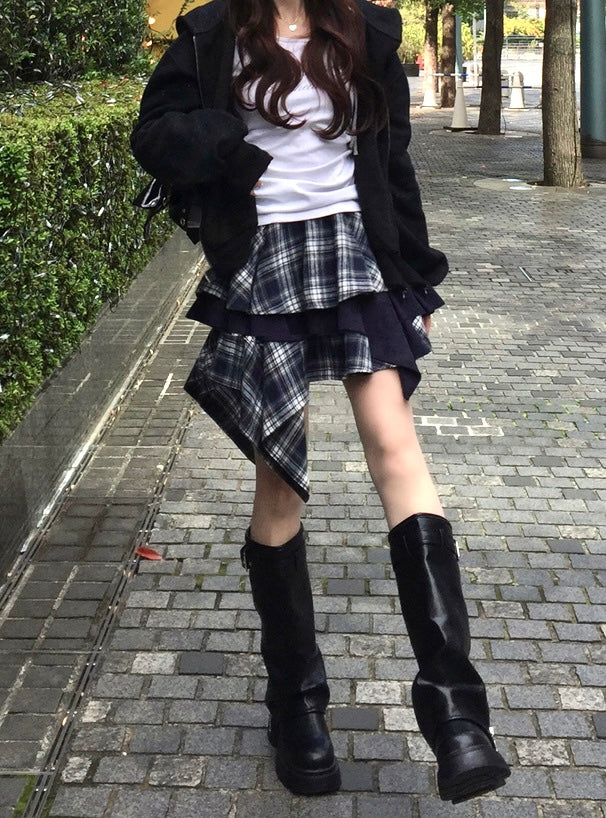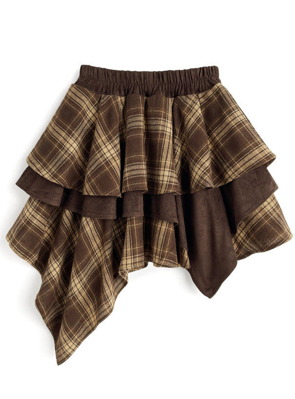 ♡下擺不規則Ruffle·拼接格仔短裙