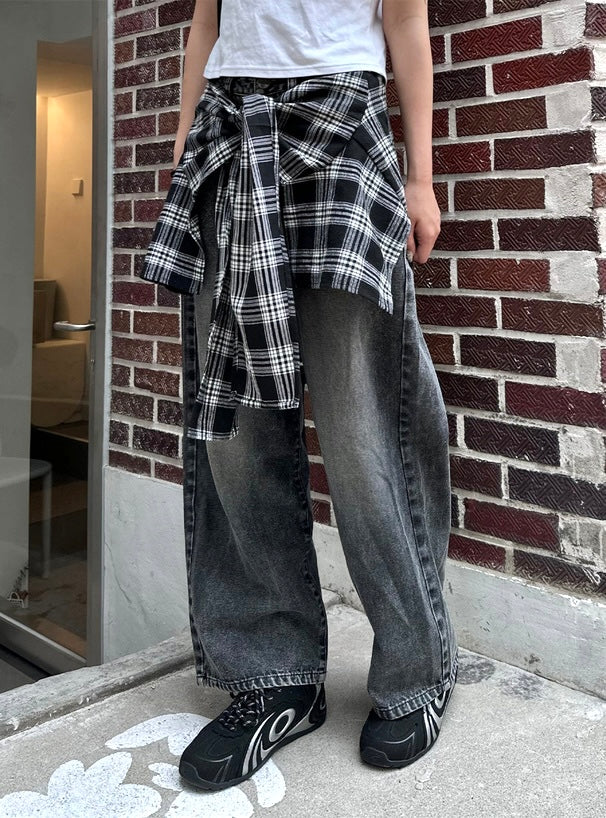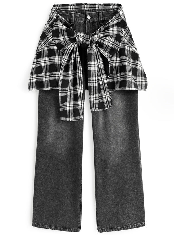 ♡格仔恤布·拼接牛仔褲