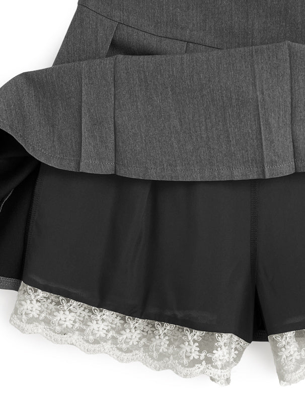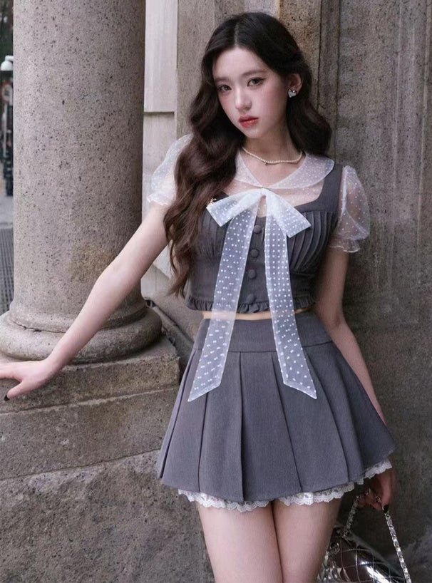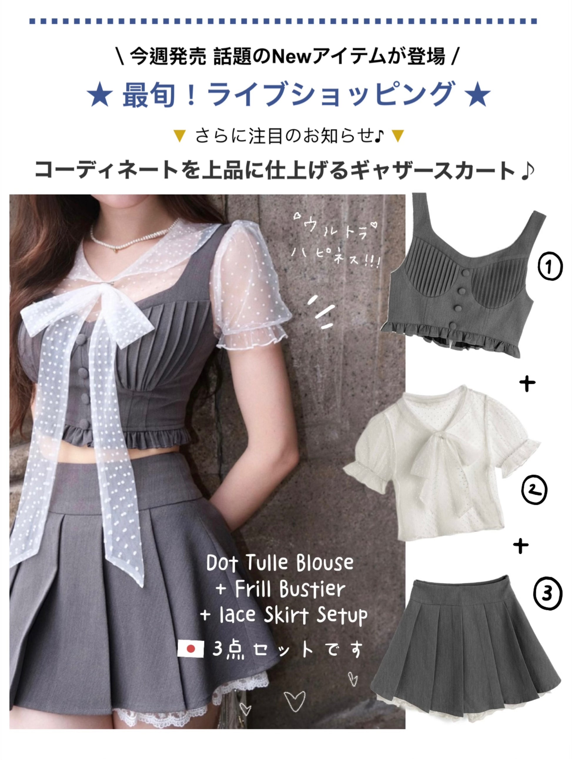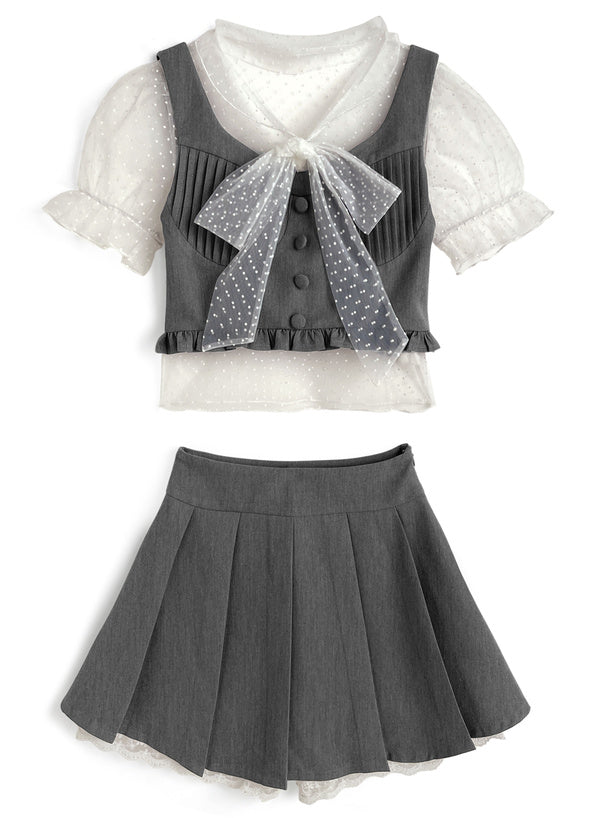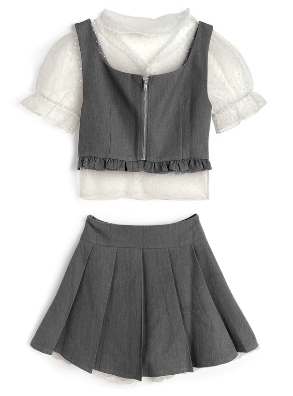 日本直送 [預購] 一套3件 ⇉ Dot薄紗上衣➕荷葉邊背心➕Lace百褶裙