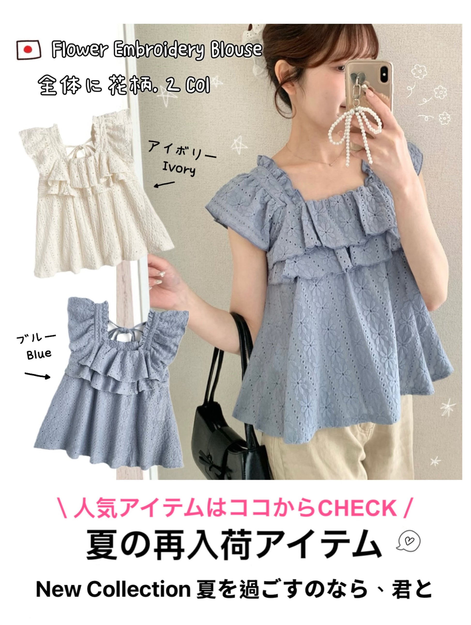 日本直送 [預購 - 日本7月下旬發貨] 花花壓花·Ruffle邊上衣 ◍ 2色入