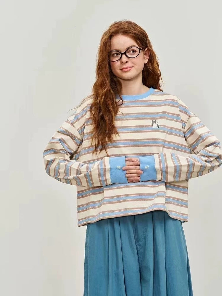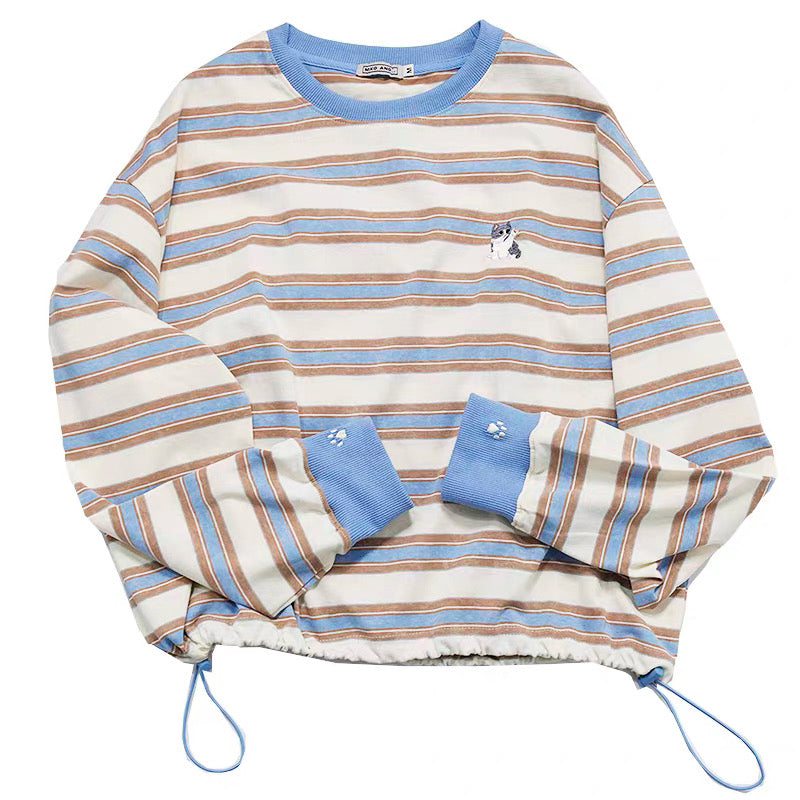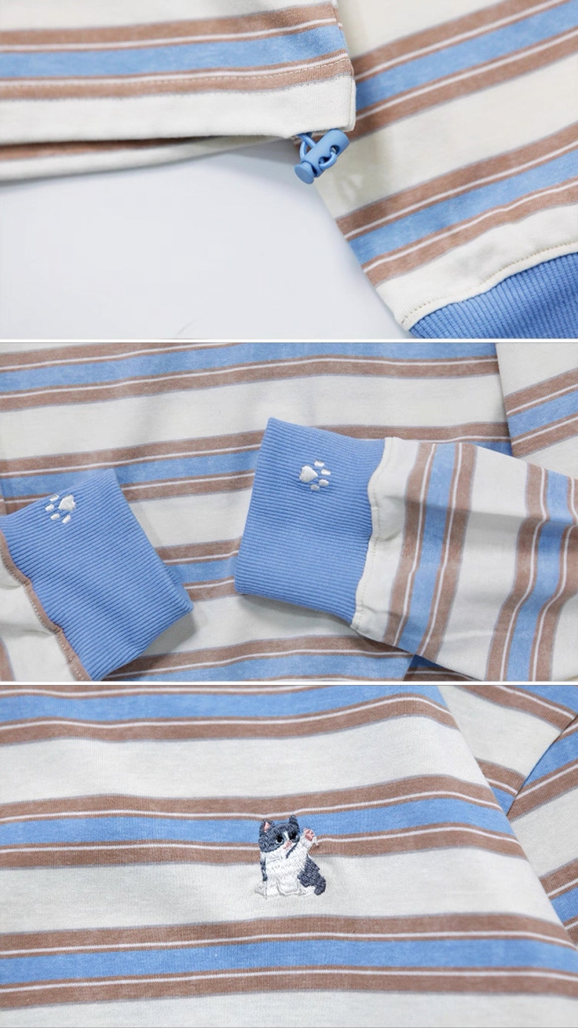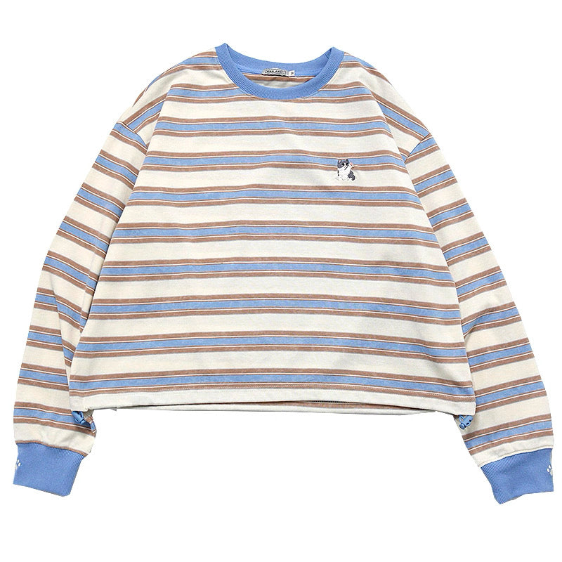 日本直送 [現貨] 貓仔刺繡·間條上衣 (藍 ブルー)