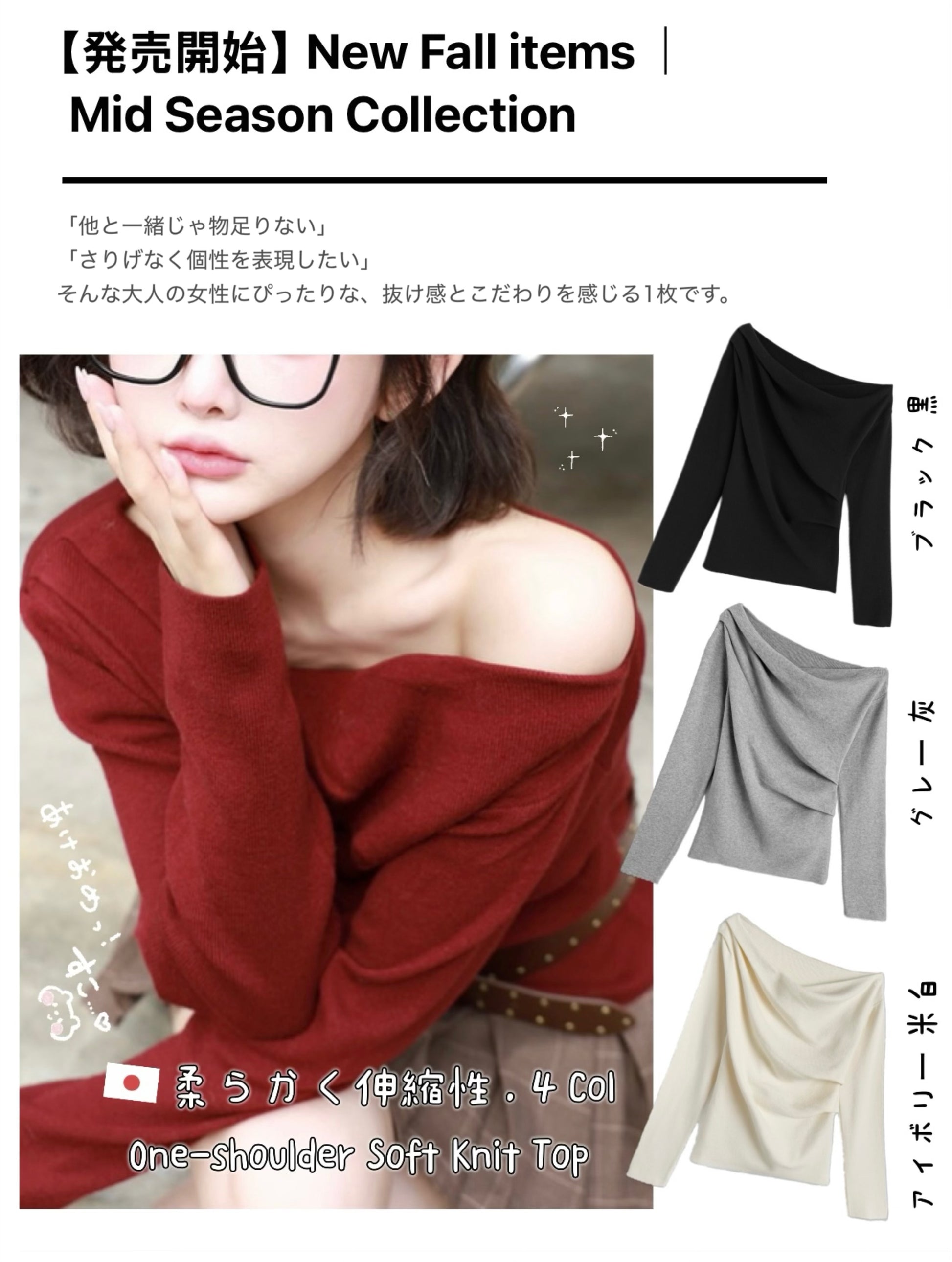 日本直送 [預購] 100度輕盈親膚☁️ 露肩針織上衣 ◍ 4 色入