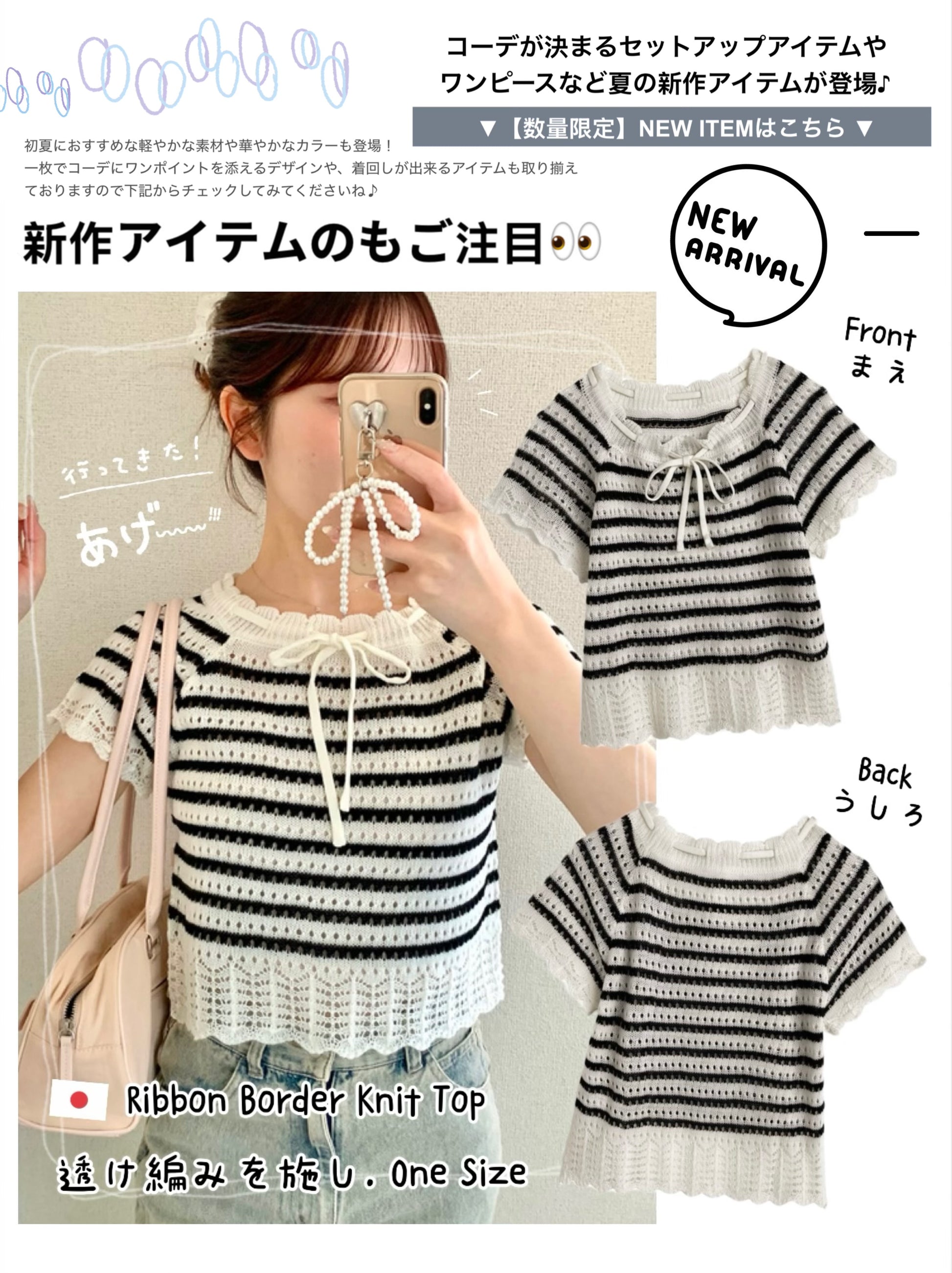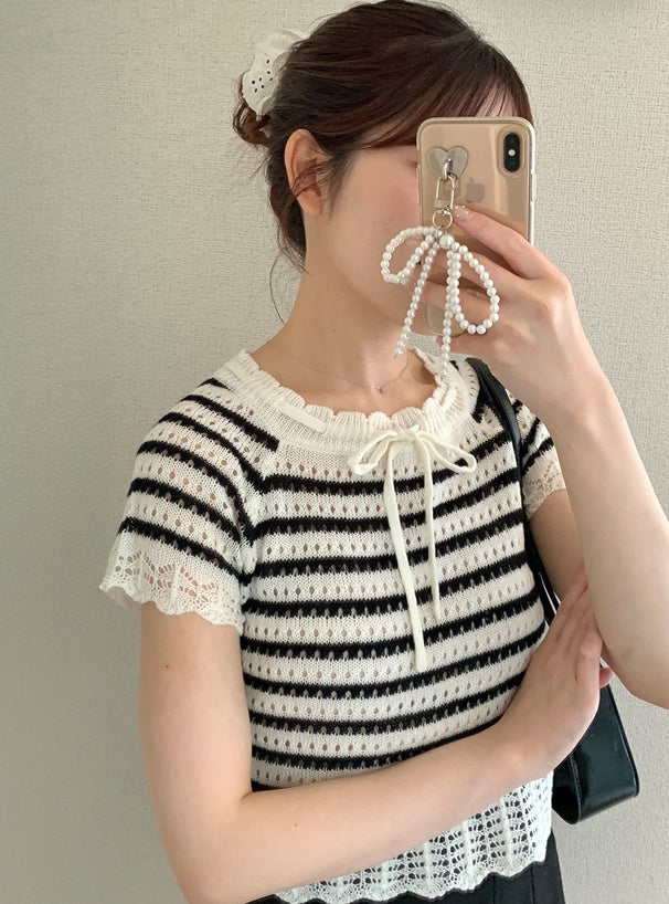 日本直送 [預購] 間條鏤空針織配蝴蝶౨ৎ 上衣
