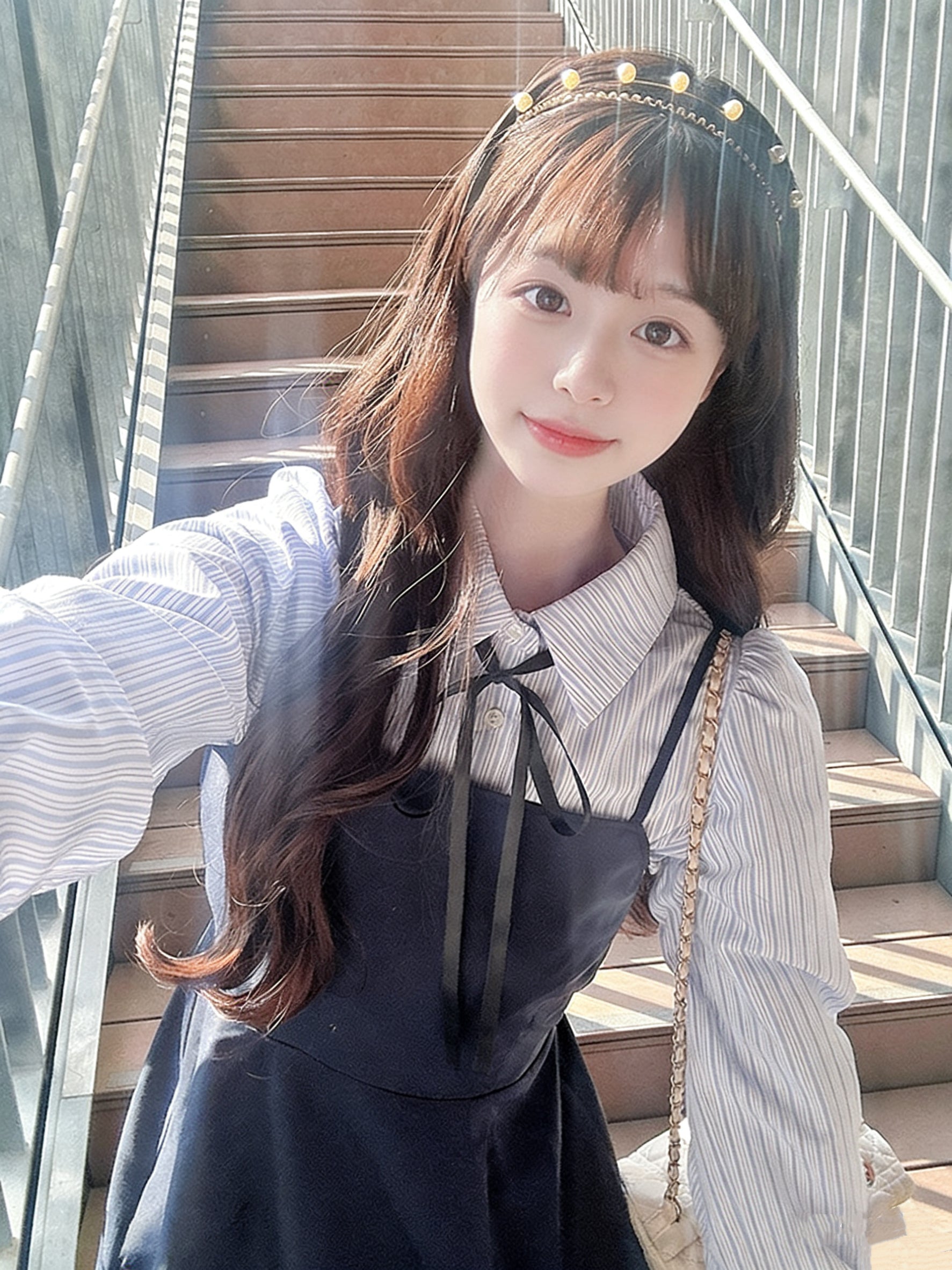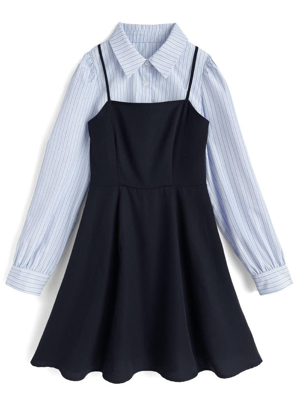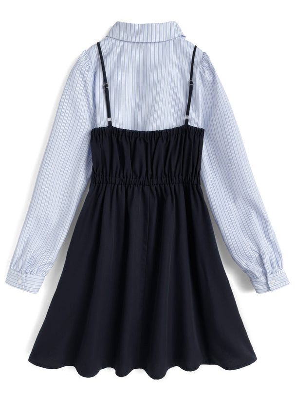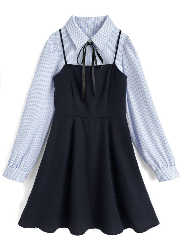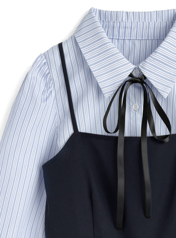 日本直送 [預購] 一套2件setup ⇉ 間條恤衫配౨ৎ蝴碟帶➕吊帶裙 (深藍 ネイビー)