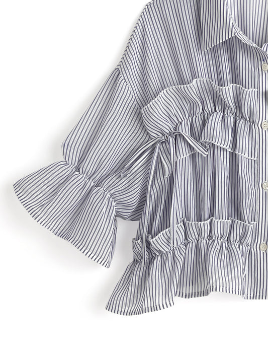 日本直送 [預購] 輕·透·間條皺褶౨ৎ上衣 (深藍)