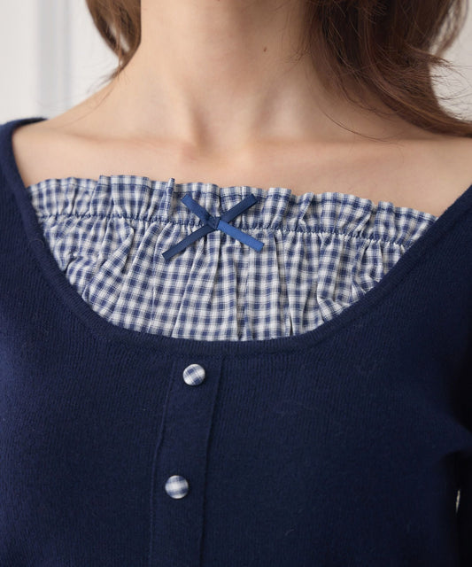日本直送 [預購] 拼接格仔領口౨ৎ針織上衣 (ダークブルー 深藍)