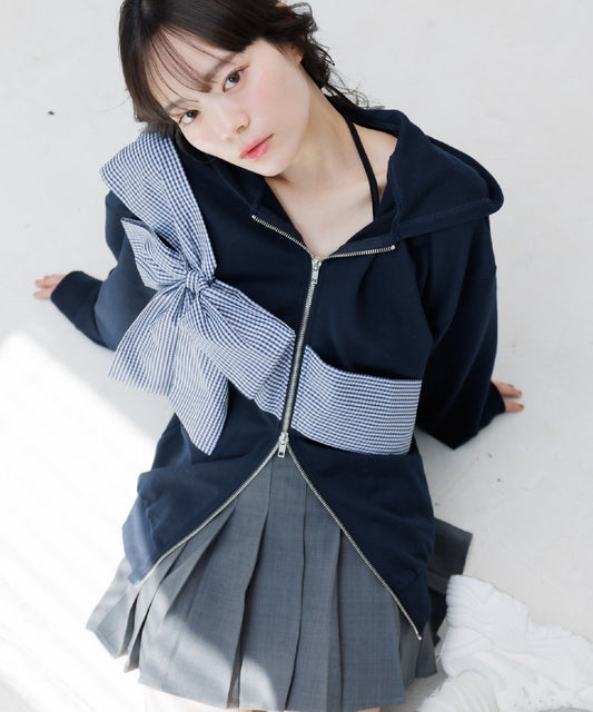 日本直送 [預購] 拼接格仔蝴蝶結 ౨ৎ帶帽外套 ◍ 2色入